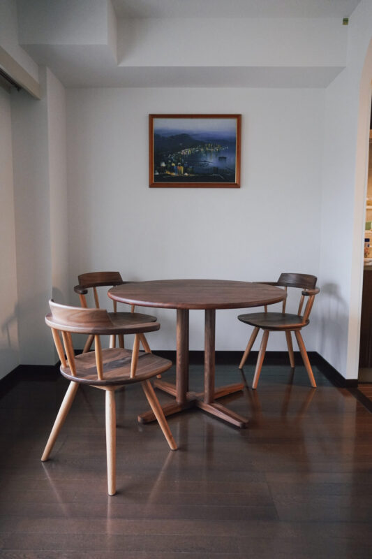 横からのフォルムや天板の仕上げが美しいダイニングテーブルです。