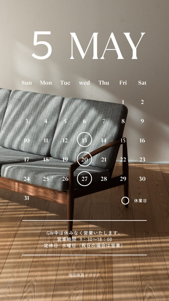 2026.4.19 SOLID Villa KARUIZAWAお知らせピックアップ上田 SHOWROOM 5月の営業日のお知らせ いつも塩田家具リヴリアをご愛顧いただきありがとうございます。5月の営業日について、以下の通りご案内いたします。 ■塩田家具リヴリア(上田店) ※5月6日(水)は祝日のため、営業いたします。営業時間:9:30~18:00定休日:毎週水曜日(祝日の場合は、営業いたします)GW中もみなさまのご来店、お待ちしております。 一覧に戻る