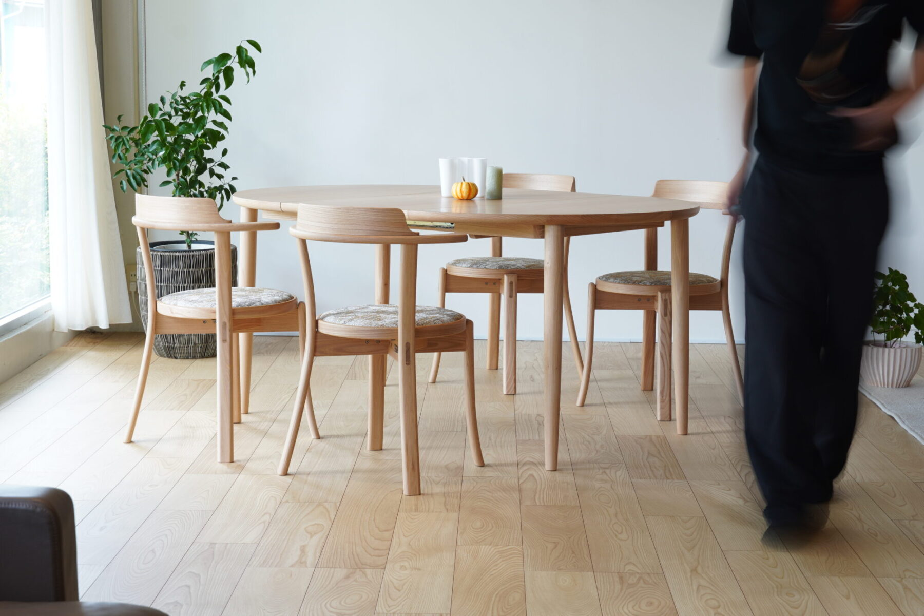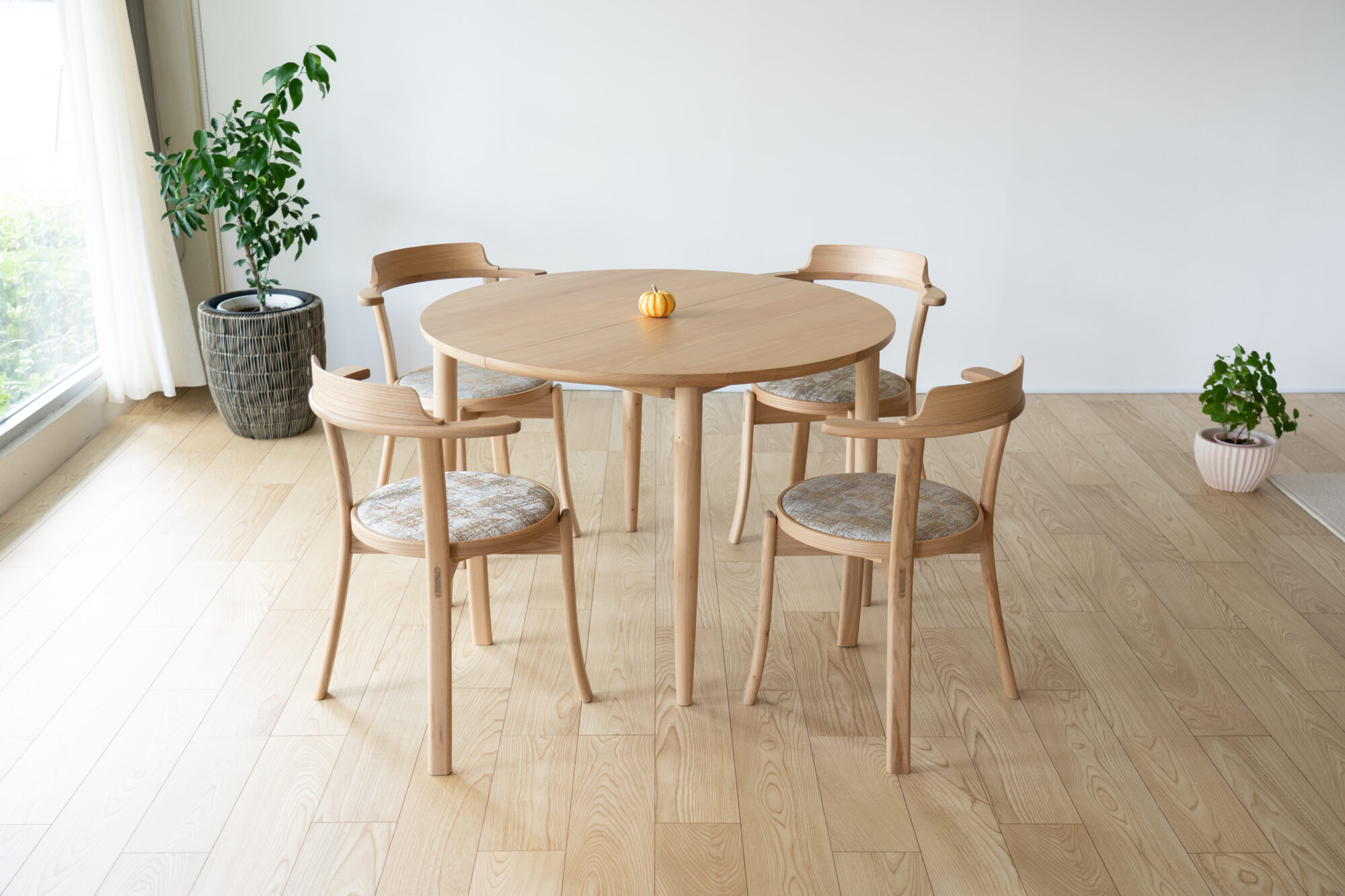 φ105の場合、伸縮時は2〜4人で、広げた時には椅子が6脚収まります。φ120は、よりゆったりと使いたい方や、座幅の広い椅子やアームチェアーを組み合わせたい方におすすめです。普段はコンパクトに使い、友人が集まった時や仕事をする時にはさっと広げて天板を大きく活用。用途が広がる便利なテーブルです。