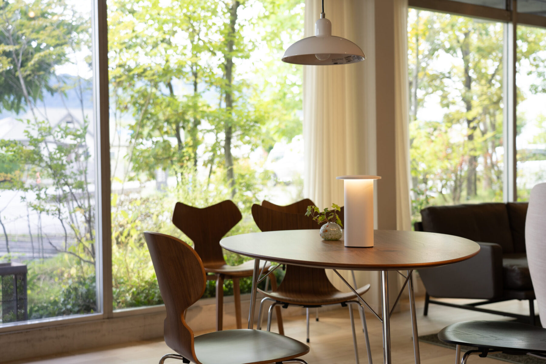 また、ランプの高さや光源位置が、直接まぶしさを感じさせないよう配慮されており、テーブル中央に置いても視覚的に反発しない設計です。
