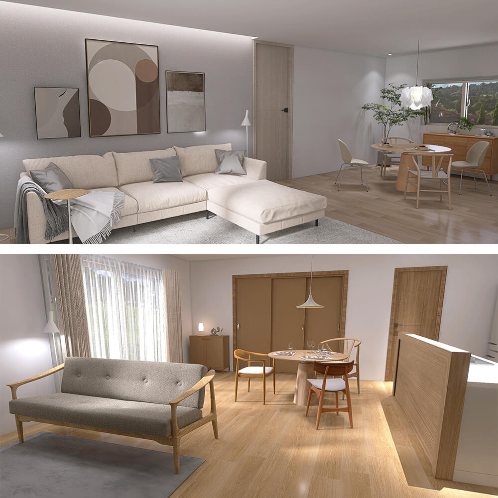 家具を配置した時のイメージを3Dや2Dでご覧いただくことが可能です。(一部有料のサービスになります。詳細につきましては、お問い合わせの際にご確認くださいませ。)